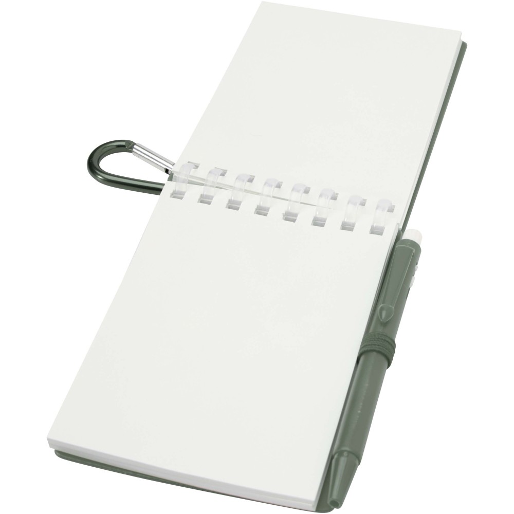 A Lig Mini jegyzetfüzet és toll szett kompakt és praktikus társ a gyors jegyzeteléshez útközben. A spirálfüzet puha, újrahasznosított műanyag borítással és 70 darab, 120 g/m2 súlyú, vízálló kőpapírból készült üres lappal rendelkezik, így ideális választás szabadtéri használatra is. A kerekített sarkokkal és beépített tolltartó pánttal ellátott kiegészítő tökéletesen követi a "mini" trendet, miközben teljesen funkcionális marad. A szetthez tartozó golyóstoll újrahasznosított ABS műanyagból készült, fekete tintával ír, íráshossza pedig 250 méter. A színben harmonizáló fémgyűrű segítségével a szett könnyen rögzíthető hátizsákra, táskára vagy kulcscsomóra, így tartós és hordozható megoldást nyújt a jegyzetek rögzítéséhez. A jegyzetfüzet mérete: 11 × 7,5 cm.