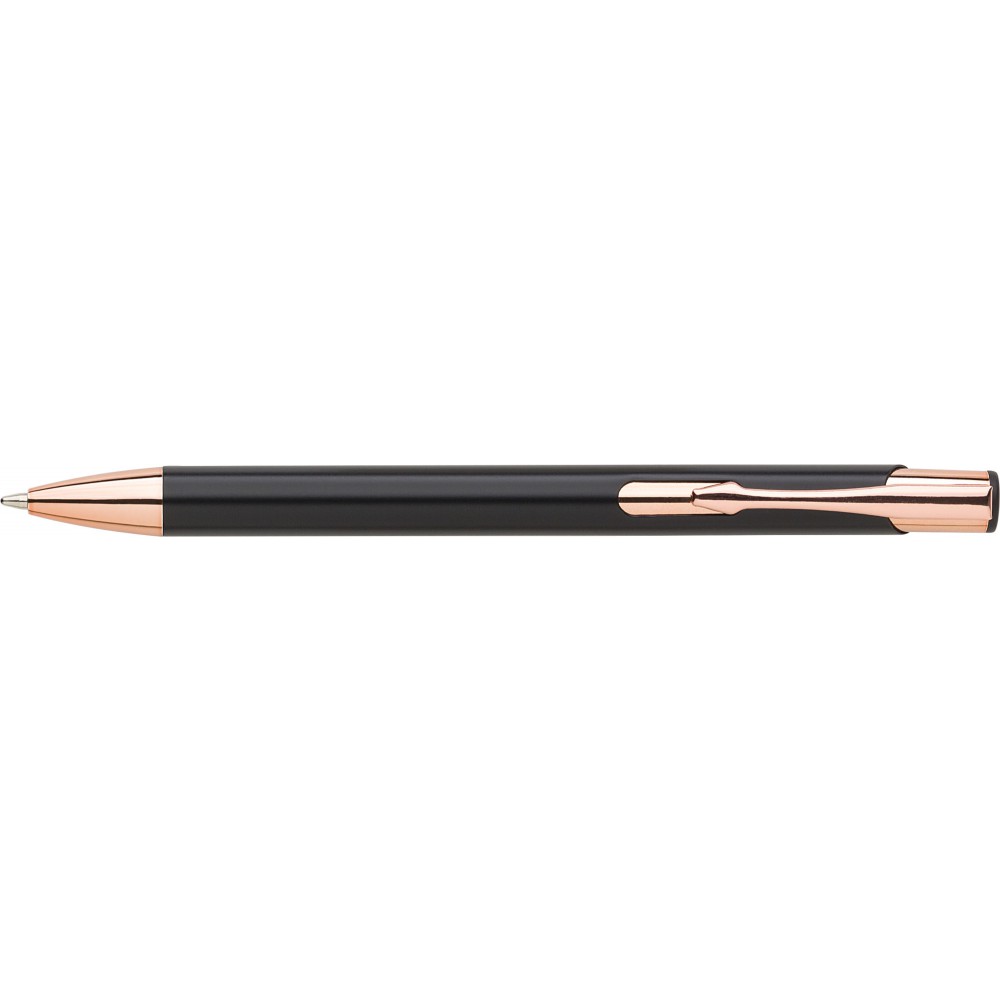 Alumínium golyóstoll matt felülettel, rózsaarany részletekkel, kék tollbetéttel.