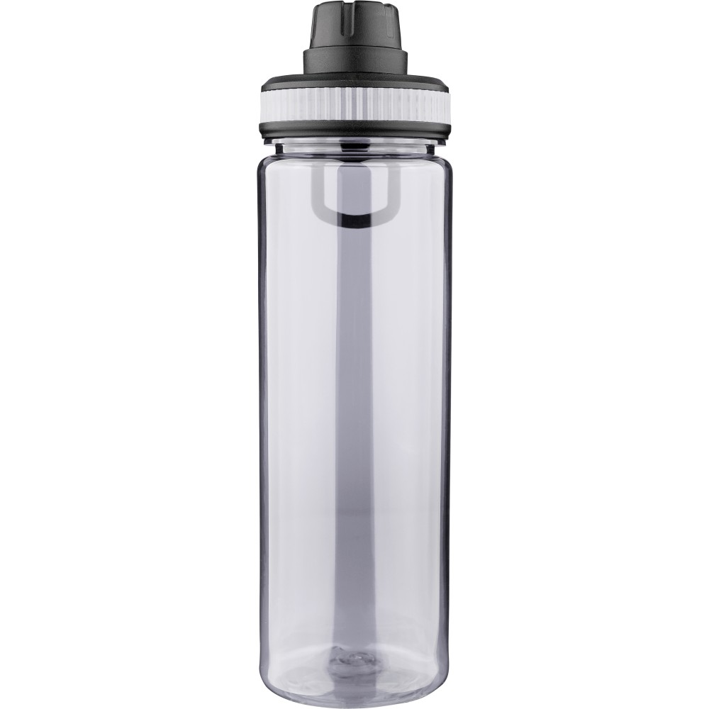 RPET anyagból készült ivópalack PP kupakkal, amely hordozófüllel és csavaros záródással rendelkezik, valamint a palack áttetsző testének színével harmonizáló szilikon díszítéssel. Űrtartalma 750 ml.